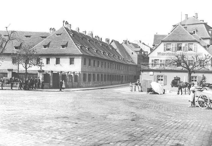 | Keywords: Langgasskaserne und Weinwirtschaft Messerschmitt 1892.jpg <br>Links Die Langgaßkaserne die früher auf dem westlichen Teil des Schönleinsplatzes stand und im Auftrag des Fürstbischofs Lothar Franz von Schönborn von Leonhard Dientzenhofer errichtet wurde <br>Rechts Weinwirtschaft Messerschmitt Lange Straße 41 Elternhaus des Flugzeugpioniers Prof Willy Messerschmitt D-4-61-000-573 en historic photography of Bamberg Germany scanned from book Peter Moser Das Album des Alois Erhardt Bamberg Babenberg Verlag GmbH 2002 ISBN 3-933469-07-4 Alois Erhardt century 19 PD-old Buildings in Bamberg Alois Erhardt Schönleinsplatz Bamberg Lange Straße Bamberg Barracks in Bavaria Leonhard Dientzenhofer Wine taverns Willy Messerschmitt |