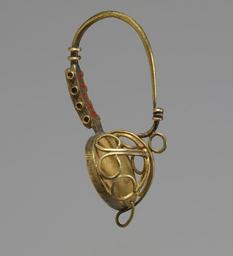 | Keywords: Langobardic - Basket Earring - Walters 57476 - Left Side.jpg One of the most common types of Langobardic jewelry the basket earring derives its name from the hemispherical basket of gold wire as in this example The front disk of gold is inlaid with gold wire cells for four red glass or garnet inserts arranged like the arms of a cross around a central circular cell filled with a rounded green stone or glass A triad arrangement of one large and two small circular gold wire circlets fills the space between the garnet inlays and creates a ring around the cross A thick flattened lip of gold decorated with hatching and cross-hatching overlays the outer edge of the disk where it joins the basket On the front of the hoop are a row of five cells for red glass or garnet inlays of which three are still filled The sides of the hoops are decorated with a row of four wire circlets A loop attached to the base of the earring once suspended an additional pendant late 6th-7th century Early Medieval glass paste and garnet on gold cm 5 1 1 9 2 4 accession number 57 476 3956 Joseph Brummer Paris Henry Walters city Baltimore Walters Art Museum Henry Walters Acquired by Henry Walters Early Christian and Byzantine Art Baltimore Museum of Art Baltimore 1947 Jewelry - Ancient to Modern The Walters Art Gallery Baltimore 1979-1980 place of origin Italy Walters Art Museum license Medieval metalwork in the Walters Art Museum Jewellery in the Walters Art Museum Lombard jewellery from Italy Media contributed by the Walters Art Museum needs category review |