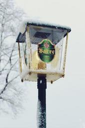 Keywords: lantern pub light snow snowfall snowy winter cold ice glass lighting lamp light source atmosphere mood bulbs candlestick hell
