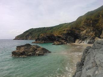 Keywords: lantic bay cornwall beach rock water ocean waves hills blue nature landscape