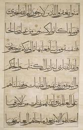 | Keywords: Large Koran.jpg Timurid dynasty circa 1400<br /> Opaque watercolor ink and gold on paper Muḥaqqaq script<br /> 170 x 109cm 66 15/16 x 42 15/16in <br /> Historical Region Uzbekistan This first and the last verses are incomplete The translation of all the verses in their complete form according to Muhsin Khan would be Say O Muhammad to those who have believed that they should forgive those who expect not the days of Allah so that He may recompense a people for what they used to earn Whoever does a good deed - it is for himself; and whoever does evil - it is against the self Then to your Lord you will be returned And We did certainly give the Children of Israel the Scripture and judgement and prophethood and We provided them with good things and preferred them over the worlds And We gave them clear proofs of the matter of religion And they did not differ except after knowledge had come to them - out of jealous animosity between themselves Indeed your Lord will judge between them on the Day of Resurrection concerning that over which they used to differ 45 14-17 the English language Wikipedia http //en wikipedia org/w/index php title Special Log page File Large_Koran jpg log uploaded by en User Kodemage February 18 2006 original upload date Assessments 1 PD-Art Qur'an manuscripts 14th-15th century Timurid dynasty |