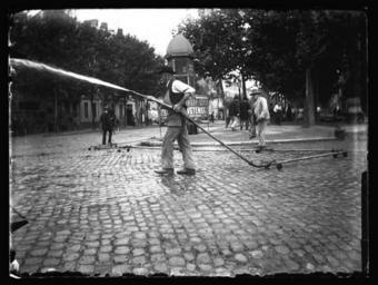 | Keywords: L’arroseur public - 51Fi136 - Fonds Trutat.jpg Artwork Creator Eugène Trutat Rue de Toulouse Entre 1858 et 1907 Vue d'ensemble d'un arroseur public en pleine action au milieu d'une rue Au premier plan route pavée ; au second plan vue de profil homme chemise tablier chapeau chaussures dans les deux mains à l'horizontale tuyau d'arrosage eau ; en arrière plan trottoir passants mobilier d'affichage arbres between 1858 1907 photograph glass cm 9 12 Institution Archives municipales de Toulouse object history ProvenanceEvent 1971 gift Association des Toulousains de Toulouse Jean Trutat ProvenanceEvent 2006-12-14 deposited Archives municipales de Toulouse Association des Toulousains de Toulouse credit line 51Fi136 Fonds Eugène Trutat - Archives municipales de Toulouse PD-old-100 Black and white photographs Black and white photographs of people at work Cobblestones in France Fonds Trutat - Archives municipales de Toulouse 51Fi136 Hoses Men at work in France People of Toulouse Photographs of Toulouse by Eugène Trutat Street cleaning in France Unidentified streets in Toulouse |