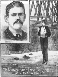 | Keywords: Larry Donovan Jump off Suspension Bridge at Niagara Falls.png Larry Donovan jumping from the suspension bridge at Niagara Falls Inset close up of his face 1887-06-18 Cropped images from the cover of the Police News Law Courts and Weekly Record 1887-06-18 UK Accessed via Gale Newsvault author other versions PD-old-70-1923 Larry Donovan bridge jumper | ||||
