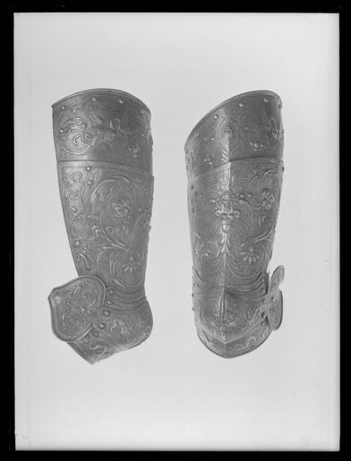 | Keywords: Lårskena h - Livrustkammaren - 51580.tif Av driven stålplåt av sammanlagt sju delar <br/><br/>Övre del av två större välvda skenor Övre kanten omvikt rundsmidd snett avtagen och lutande inåt Sidorna raka och släta Upptill en nitad triangulär sämskad läderbit med brun läderrem för att fästa lårpansaret i harnesket <br/>Knäbuckla välvd med övre och undre kant utdragen till spets och vertikal mittås Avsmalnade åt sidorna inåt tvärt avslutad och utåt övergående i oval mussla med rundade kanter och i mitten V-formig tvärt avslutad spets Över bucklan två mindre skenor under bucklan en mindre och en större skena Den synliga kanten utdragen till tre spetsar Yttre kanterna omvikta och rundsmidda Driven mittås löper över samtliga skenor även om den bitvis försvinner i dekoren I inre kant upptill och nertill söljor nertill sitter söljan i läderrem På motsvarande plats mot utsidan två läderremmar med rester av svärtning l 380 och 235 mm original caption lårskena h - LRK 26085 1562 steel plate - leather Färg brun material läder - chamois leather Färg gul material sämskskinn size mm 480 inkl knä g 1093 size mm 160 LRK Erik XIV av Sverige Sweden - A Royal Treasury 1988-1989 Tre Konungar på Åbo slott 1993 Örnen och de tre kronorna 2003 Parures Triomphales 2003 Sous l'égide de Mars Armures des Princes d'Europe' tid arbetstitel Armures et décors maniéristes francais 2011 Musée de l'Armée place of origin original filename LN_A02176_002176 62753 inventory number LRK 26085 51580 CC0 Lårskena h - Livrustkammaren - 51580-negative tif Eliseus Libaerts Tassets Media contributed by LSH dim-with multiple size templates Media contributed by LSH unmatched creator Cuisse images from Livrustkammaren Media contributed by LSH 2013-10 |