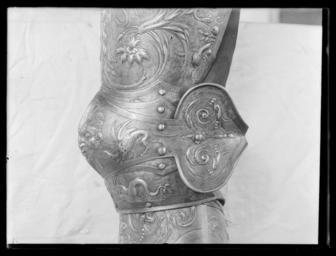 | Keywords: Lårskena - Livrustkammaren - 25696.tif LSH artwork Eliseus Libaerts guldsmed sv Av driven stålplåt av sammanlagt sju delar <br/><br/>Övre del av två större välvda skenor Övre kanten omvikt rundsmidd snett avtagen och lutande inåt Sidorna raka och släta Upptill en nitad triangulär sämskad läderbit med brun läderrem för att fästa lårpansaret i harnesket <br/>Knäbuckla välvd med övre och undre kant utdragen till spets och vertikal mittås Avsmalnade åt sidorna inåt tvärt avslutad och utåt övergående i oval mussla med rundade kanter och i mitten V-formig tvärt avslutad spets Över bucklan två mindre skenor under bucklan en mindre och en större skena Den synliga kanten utdragen till tre spetsar Yttre kanterna omvikta och rundsmidda Driven mittås löper över samtliga skenor även om den bitvis försvinner i dekoren I inre kant upptill och nertill söljor nertill sitter söljan i läderrem På motsvarande plats mot utsidan två läderremmar med rester av svärtning l 380 och 235 mm original caption lårskena - LRK 26086 1562 steel plate - leather Färg brun material läder - chamois leather Färg gul material sämskskinn g 1167 size mm 435 170 LRK Erik XIV av Sverige Sweden - A Royal Treasury 1988-1989 Tre Konungar på Åbo slott 1993 Örnen och de tre kronorna 2003 Parures Triomphales 2003 Sous l'égide de Mars Armures des Princes d'Europe' tid arbetstitel Armures et décors maniéristes francais 2011 Musée de l'Armée place of origin original filename LN_A00133_000133 62754 inventory number LRK 26086 25696 CC0 Lårskena - Livrustkammaren - 25696-negative tif Eliseus Libaerts Tassets Media contributed by LSH unmatched creator Media contributed by LSH 2014-06 |
