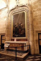 | Keywords: Las santas Justa y Rufina, de Francisco de Goya. (Sacristía de los Cálices de la catedral de Sevilla).JPG El cabildo catedralicio sevillano le encargó este cuadro a Goya en 1817 y por mediación de Agustín Ceán Bermúdez que era un erudito y escritor de arte y amigo personal de Goya El cuadro estaba destinado al altar de la Sacristía de los Cálices de la catedral de Sevilla España donde aún permanece Y conviene señalar que las santas alfareras Justa y Rufina que son las patronas de Sevilla fueron martirizadas por haberse negado a adorar una imagen de la diosa Venus y siempre suelen ser representadas junto a objetos de barro como símbolo de su profesión y con las palmas del martirio En esta obra un león lame mansamente el pie de Santa Rufina herido por haberla forzado a caminar desde la sierra hasta Sevilla y esta ciudad aparece al fondo destacándose la Torre de la Giralda de la catedral sevillana que según la tradición quedó en pie por la intervención milagrosa de estas mártires durante el terremoto que asoló Sevilla en 1504 1817 oil canvas Size cm 177 309 Institution Catedral de Santa María de la Sede de Sevilla Sacristía de los Cálices de la catedral de Sevilla https //www museodelprado es/coleccion/galeria-on-line/galeria-on-line/obra/santa-justa-y-santa-rufina/ object history exhibition history credit line accession number own PD-old-100 cc-by-sa-4 0 Santas Justa y Rufina Francisco de Goya |