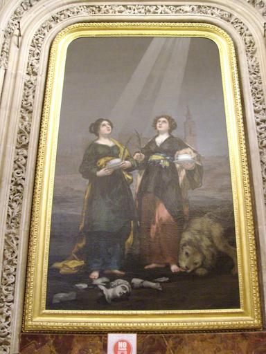 | Keywords: Las santas Justa y Rufina, de Francisco de Goya (Sacristía de los Cálices de la catedral de Sevilla).jpg El cabildo catedralicio sevillano le encargó este cuadro a Goya en 1817 y por mediación de Agustín Ceán Bermúdez que era un erudito y escritor de arte y amigo personal de Goya El cuadro estaba destinado al altar de la Sacristía de los Cálices de la catedral de Sevilla España donde aún permanece Y conviene señalar que las santas alfareras Justa y Rufina que son las patronas de Sevilla fueron martirizadas por haberse negado a adorar una imagen de la diosa Venus y siempre suelen ser representadas junto a objetos de barro como símbolo de su profesión y con las palmas del martirio En esta obra un león lame mansamente el pie de Santa Rufina herido por haberla forzado a caminar desde la sierra hasta Sevilla y esta ciudad aparece al fondo destacándose la Torre de la Giralda de la catedral sevillana que según la tradición quedó en pie por la intervención milagrosa de estas mártires durante el terremoto que asoló Sevilla en 1504 1817 oil canvas Size cm 177 309 Institution Catedral de Santa María de la Sede de Sevilla Sacristía de los Cálices de la catedral de Sevilla https //www museodelprado es/coleccion/galeria-on-line/galeria-on-line/obra/santa-justa-y-santa-rufina/ object history exhibition history credit line accession number own PD-old-100 GFDL cc-by-sa-3 0 2 5 2 0 1 0 Santas Justa y Rufina Francisco de Goya Images by Harmonia Amanda |