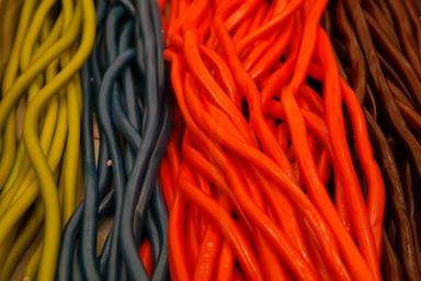 Keywords: lasso lakritzstangen yellow blue red brown sweetness colorful color food nibble sweet year market fair delicious calories unhealthy
