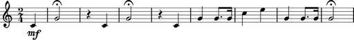 | Keywords: Last Post excerpt.svg First phrase of the Last Post; full version at Image Last Post png Original at http //wikisophia org/wiki/Last_Post Generated from the following LilyPond code <pre> \version 2 8 0 \header tagline \paper print-page-number f \score \time 2/4 \relative c \partial 4 c 4 \mf g'2\fermata r4 c 4 g'2\fermata r4 c 4 g' g8 g16 c4 e g g8 g16 g2\fermata \midi \tempo 4 80 \layout </pre> own Wereon PD-old Check categories 2008 November 8 zh wikipedia 後崗位 Sheet music Last Post | ||||