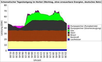 | Keywords: Lastgang.svg en Schematic power load profile from the German power grid in the course of a day itemized by different technologies of power plants de Die Abbildung zeigt schematisch den Einsatz der unterschiedlichen Kraftwerkstechnologien für einen typischen Tagesgang Werktag in einer Herbstwoche des Stromverbrauches sogenannter Lastgang im deutschen Elektrizitätsnetz Es wurde versucht die tatsächliche Verhältnismäßigkeit und Leistungsgröße im Schaubild wiederzugeben In den Nachtstunden füllen die Pumpspeicherkraftwerke ihre Speicherbecken auf und verursachen zusätzlichen Verbrauch Pumpbetrieb Fluktuierende Erzeuger wie Wind- oder Sonnenenergie wurden zur Vereinfachung weggelassen own Seisofrei 2011-01-16 Datei Tagesgang png Eigene Auftragung mit Anlehnung an žDer Weg zu 100 erneuerbaren Energien am Beispiel der Stadtwerke Schwäbisch Hall GmbH S 13 http //www forum-netzintegration de/uploads/media/DUH_VanBergen_WS2_07052010 pdf BMWi žVoraussetzungen einer optimalen Integration erneuerbarer Energien in das Stromversorgungssystem S 36 http //www bmwi de/BMWi/Redaktion/PDF/Publikationen/Studien/endbericht-optimale-intergration-erneuerbare-energie property pdf bereich bmwi sprache de rwb true pdf und Hilfsblätter zur Vorlesung Energiewirtschaft EWS Prof Dr -Ing Gregor Krause S 12 http //www krause fh-aachen de/userfiles/file/EWS/ews_kap4 pdf Cc-zero Electric power generation |