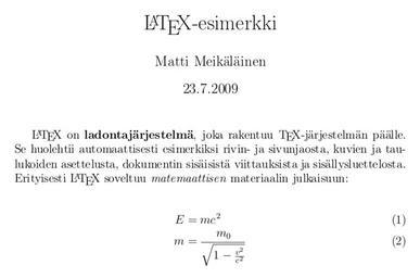 | Keywords: LaTeX-esimerkki.svg en LaTeX example in finnish fi LaTeX-esimerkki suomeksi Own work by uploader Source code <source lang latex > \documentclassa4paper 12pt finnish article \usepackage babel \usepackageutf8 inputenc \usepackageT1 fontenc \usepackage amsmath \title \LaTeX-esimerkki \author Matti Meikäläinen \date 23 7 2009 \begin document \maketitle \LaTeX on \textbf ladontajärjestelmä joka rakentuu \TeX -järjestelmän päälle Se huolehtii automaattisesti esimerkiksi rivin- ja sivunjaosta kuvien ja taulukoiden asettelusta dokumentin sisäisistä viittauksista ja sisällysluettelosta Erityisesti \LaTeX soveltuu \textit matemaattisen materiaalin julkaisuun Tämä on kommentti eikä näy lopullisessa dokumentissa Seuraavassa on demonstroitu matemaattisten kaavojen esittämistä \begin align E mc 2 \\ m \frac m_0 \sqrt 1-\frac v 2 c 2 \end align \end document </source> Tmn 2009-09-03 Images with LaTeX source code |