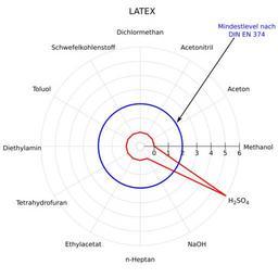 | Keywords: Latex-Spinne v2.svg Spinnendiagramm Beständigkeit von Latex-Schutzhandschuhen Glove selection Latex Own after http //www dguv de/dguv/medien/ifa/de/pra/chemikalienschutzhandschuhe/pdf/latex pdf 2015-01-23 Kopiersperre code by StefanPohl PD-own Inkscape gnuplot reset set term svg size 700 700 fname 'Verdana' fsize 12 set size square 9 set lmargin at screen 15 set tmargin at screen 9 set angles degrees unset key unset border set polar set rtics 0 0 1 1 2 2 3 3 4 4 5 5 6 6 7 set rrange 1e-2 7 unset xtics unset ytics set grid polar 30 lt 1 lc 0 lw 0 3 set_label x text sprintf set label ' s' at 8 cos f 8 sin f center text x x eval set_label 0 Methanol 0 eval set_label 30 Aceton 0 eval set_label 60 Acetonitril 0 eval set_label 90 Dichlormethan 0 eval set_label 120 Schwefelkohlenstoff 0 eval set_label 150 Toluol 0 eval set_label 180 Diethylamin 0 eval set_label 210 Tetrahydrofuran 0 eval set_label 240 Ethylacetat 0 eval set_label 270 n-Heptan 0 eval set_label 300 NaOH 6 eval set_label 330 H2SO4 0 set output 'latex svg' plot - u 1 2 t Latex w l lt 1 lw 3 lc rgb 0xFF0000 0 1 30 1 60 1 90 1 120 1 150 1 180 1 210 1 240 1 270 1 300 1 330 7 360 1 e unset output Chemical resistance diagrams |