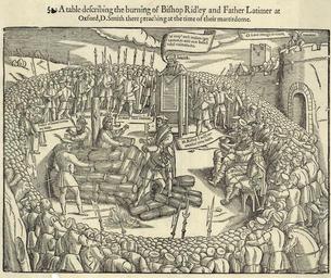 | Keywords: Latimer Ridley Foxe burning.jpg Hugh Latimer and Nicholas Ridley martyred by being burnt at the stake John Foxe's book of martyrs 1563 edition When looking at these images which portray ideas such as martyrdom it is always interesting to know how historical the depiction is in this case less than ten years after the event An X marks the spot in Broad St Oxford where they were burnt when it was the Town Ditch outside the walls St Michael at the Northgate is now hidden behind a row of houses and it is in this Saxon Tower http //www smng org uk/ that the two martyrs were imprisoned before being burnt You will notice a Saxon tower their prison in the background of the print Oxford City Museum shows a barbican at this point in the walls in a map of 1578 So by and large this seems to show it like it was place of discovery object history exhibition history credit line accession number place of creation https //www johnfoxe org/woodcuts/f1805ins5 gif Image Foxe's Book of Martyrs - Latimer Ridley jpg PD-old Foxe's Book of Martyrs 1555 Christianity in the United Kingdom Stake in engravings Executions in England History of Oxford Nicholas Ridley Hugh Latimer |