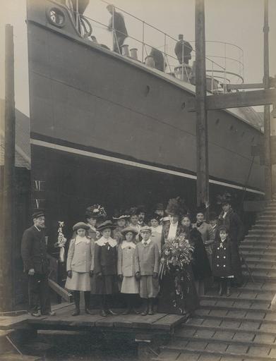 Keywords: ww1 royal navy royalnavy first world war firstworldwar hawthorn leslie hawthornleslie shipbuilding hebburn hms greyhound hmsgreyhound destroyer torpedo boat destroyer torpedoboatdestroyer shipyard black and white photograph blackandwhitephotograph maritime heritage maritimeheritage children roman numerals romannumerals vessel ship 6 october 1900 6october1900 c-class destroyer cclassdestroyer anti-submarine antisubmarine counter-mining operations counterminingoperations warship construction plate steel metal launch party launchparty launch gathering design clothes dress stockings blouse hat coat button glove shoes shine trousers shirt jacket beard moustache timber plank platform flower decoration unusual scarf men women boys girls girl porthole glass reflection deck rail sailor crew cylinder pipe brick debris complacent industry workers people humanity black and white Launch party of HMS Greyhound, launched at the Hebburn shipyard of Hawthorn Leslie on 6 October 1900 (TWAM ref. 4923/1). HMS Greyhound was a C-class destroyer. During the First World War she took part in anti-submarine and counter-mining operations. The shipyard of R. & W. Hawthorn Leslie at Hebburn built many fine warships. During the First World War the firm built 2 light cruisers, 3 destroyer leaders and 25 torpedo boat destroyers. The firm also built machinery and boilers for 2 battleships, and a further 3 light cruisers. These and other warships built by Hawthorn Leslie before the War, are remembered in this set. There are remarkable images of warships under construction at Hebburn, as well as fascinating shots of the people who attended the launches. The set also contains majestic views of the ships at sea. The images are not only a testimony to the skill of those who designed and built these ships but also to the courage of those who sailed in them. (Copyright) We're happy for you to share these digital images within the spirit of The Commons. Please cite 'Tyne & Wear Archives & Museums' when reusing. Certain restrictions on high quality reproductions and commercial use of the original physical version apply though; if you're unsure please email archives@twmuseums.org.uk Launch party of HMS Greyhound, launched at the Hebburn shipyard of Hawthorn Leslie on 6 October 1900 (TWAM ref. 4923/1). HMS Greyhound was a C-class destroyer. During the First World War she took part in anti-submarine and counter-mining operations. The shipyard of R. & W. Hawthorn Leslie at Hebburn built many fine warships. During the First World War the firm built 2 light cruisers, 3 destroyer leaders and 25 torpedo boat destroyers. The firm also built machinery and boilers for 2 battleships, and a further 3 light cruisers. These and other warships built by Hawthorn Leslie before the War, are remembered in this set. There are remarkable images of warships under construction at Hebburn, as well as fascinating shots of the people who attended the launches. The set also contains majestic views of the ships at sea. The images are not only a testimony to the skill of those who designed and built these ships but also to the courage of those who sailed in them. (Copyright) We're happy for you to share these digital images within the spirit of The Commons. Please cite 'Tyne & Wear Archives & Museums' when reusing. Certain restrictions on high quality reproductions and commercial use of the original physical version apply though; if you're unsure please email archives@twmuseums.org.uk