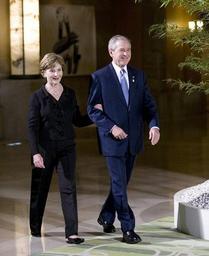| Keywords: Laura Bush and George W Bush 20080707.jpg en President George W Bush attended a dinner with Laura Bush at the Windsor Hotel Toya Resort and Spa in Tōyako Town Abuta District Hokkaidō on July 7 2008 http //www whitehouse gov/news/releases/2008/07/images/20080707_d-0354-1-631v html President George W Bush and Mrs Laura Bush arrive at the Dinner with G-8 Leaders and Spouses Monday July 7 2008 at the Windsor Hotel Toya Resort and Spa in Toyako Japan White House photo by Eric Draper White House photo by Eric Draper 2008-07-07 PD-USGov Laura and George Bush George W Bush in 2008 34th G8 summit Photographs by Eric Draper |