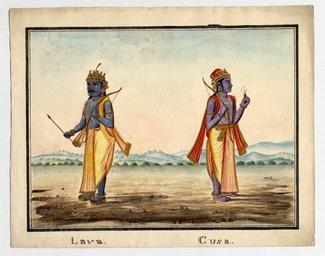 | Keywords: Lava and Kusa, the sons of Rāma..jpg en Watercolour painting on paper of Lava and Kusa the sons of Rāma Both figures are shown standing and have two arms and blue skin They wears yellow dhoti s and are crowned Lava on the left is shown holding a bow and arrow with a yellow shawl draped over his shoulders Kusa on the right is shown holding a bow and a flower with a red shawl over his shoulders Both men wear necklaces armlets and have sectarian marks drawn on their arms and chests Lava is shown wearing wooden sandals on his feet whilst Kusa is barefoot In the distance behind the pair are shown hills and trees The painting is surrounded by a black border 19thC early http //www britishmuseum org/research/search_the_collection_database/search_object_details aspx objectid 182836 partid 1 searchText ramayana fromADBC ad toADBC ad numpages 10 images on orig 2fresearch 2fsearch_the_collection_database aspx currentPage 15 Company School PD-Art Uploaded with UploadWizard Lava Kusha |