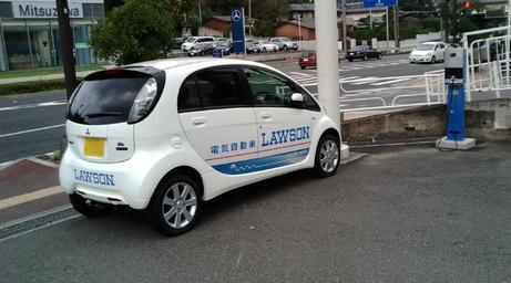 Keywords: Lawson-car.jpg en Electric-car Made by Mitsubishi mortors ja ローソン電気自動車 ローソン市民病院前店で撮影 Own Waka77 2009-09-27 Electric-automobile parts Mitsubishi i MiEV Lawson stores in Japan Electric vehicle charging stations