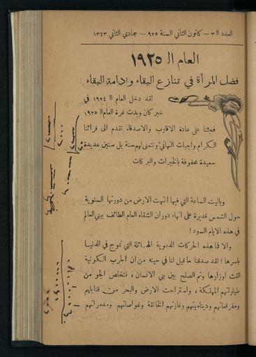 | Keywords: Layla, Issue 3, January 1925 WDL2861.jpg Artwork ru Хассун Паулина fr Hassoun Paulina en Hassoun Paulina zh 哈桑 琳 pt Hassoun Paulina ar حسون بولينا es Hassoun Paulina ru Лейла выпуск 3 янва ь 1925 г fr Layla numéro 3 janvier 1925 en Layla Issue 3 January 1925 zh Layla ,第 3 ,1925 年 1 pt Layla Edição 3 janeiro de 1924 ar ليلى، العدد 3، كانون ثاني 1925 ru <i> Лейла </i> был пе вым женским жу налом опубликованным в И аке Этот жу нал впе вые выпущенный в 1923 году был посвящен новейшим полезным воп осам связанным с наукой искусством лите ату ой социологией и в частности воспитанию и обучению девочек здо овью семьи и д угим воп осам касающимся ведения домашнего хозяйства После установления национального п авительства в И аке появилось несколько жу налов и газет посвященных женским воп осам <i> Лейла </i>ознаменовал собой за ождение женской п ессы в И аке этот жу нал считается одним из факто ов повлиявших на возникновение и фо ми ование а абского женского движения Жу нал выпускался под девизом а пути к воз ождению и акской женщины и асп ост анял новости культу ы об азования и воп осов касающихся семьи а также возглавлял кампанию за освобождение женщин В числе его азделов были следующие Испытание п авом алоговые новости Уголок домохозяйки Забавные новости Кольца магических ст ок и д угие В жу нале также освещались воп осы касающиеся исследований в области медицины лите ату ы и поэзии и были опубликованы п оизведения известных и акских поэтов аль-Расафи и аль-Захави Одной из наиболее значимых статей опубликованных в жу нале была статья вышедшая в Выпуске 6 от 15 мая 1924 года об ащенная к Уч едительному соб анию И ака с п изывом п едоставить женщинам их законные п ава Всего было выпущено <i> </i>20 выпусков жу нала Лейла В последнем выпуске от 15 августа 1925 года соде жалась печальная статья в кото ой читателям жу нала объяснялось сложное финансовое положение жу нала Вско е после этого владелица жу нала Паулина Хассун покинула И ак и жу нал п ек атил свое существование <br>Жу налы для женщин fr <i>Layla</i> a été le premier magazine féminin publié en Irak Lancée en 1923 la revue traitait de sujets nouveaux et utiles dans des domaines aussi variés que la science l'art la littérature la sociologie mais aussi l'éducation des enfants et des jeunes filles la santé familiale et d'autres sujets relevant de l'économie domestique L'établissement d'un régime républicain en Irak a été suivi par l'apparition de plusieurs journaux et magazines traitant de problématiques féminines <i> Layla </i>a marqué les débuts de la presse féminine en Irak et le magazine est considéré comme un des facteurs de l'émergence du mouvement des femmes arabes Publié sous le bandeau Sur la voie de la renaissance de la femme irakienne le magazine diffusait des informations à propos de culture d'éducation et de la famille et a également pris la tête d'une campagne de libération de la femme Ses éditoriaux avaient pour titre Le creuset du Droit Actualités fiscales Le coin des femmes au foyer Informations insolites Anneaux de cordes magiques etc Le magazine s'intéressait également à la recherche médicale à la littérature et à la poésie et a publié des oeuvres des célèbres poètes irakiens al-Rasafi et al-Zahawi L'un des plus importants articles parus dans le magazine a été l'éditorial du numéro 6 datant du 15 mai 1924 adressé à l'Assemblée constituante irakienne et lui demandant d'accorder leurs droits aux femmes Layla<i> </i>n'a connu que 20 parutions Son dernier numéro daté du 15 août 1925 comprend un article au ton triste expliquant aux lecteurs la situation financière difficile du magazine Peu de temps après la propriétaire Paulina Hassoun a quitté l'Irak et la revue a cessé de paraître <br>Périodiques féminins en <i>Layla</i> was the first women's magazine to be published in Iraq Launched in 1923 the magazine dealt with new and useful matters related to science art literature sociology and in particular to child-rearing and the education of girls family health and other matters pertaining to home economics The establishment of national rule in Iraq was followed by the emergence of several magazines and newspapers dealing with women's issues <i>Layla</i> marked the beginnings of the women's press in Iraq and the magazine is credited with being one of the factors in the emergence of the Arab women s movement Published under the banner On the Way to Revival of the Iraqi Woman the magazine disseminated news about culture education and family affairs as well as led a campaign for the lib