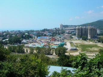 Keywords: Lazarevskoe view from mount 1.jpg en View of Lazarevskoe from mount Вид Лаза евского с го ы внизу виден аквапа к аутилус Own Vissarion 2008 Vissarion Lazarevskoe Water parks in Russia