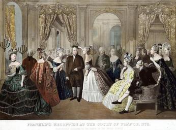 | Keywords: LC-DIG-PGA-01591: Benjamin Franklin’s Reception at the court of France, 1778. Shown is Benjamin Franklin receiving a laurel wreath upon his head. From left to right, some of the members of the French court include: Duchesse Jules de Polignac; Princesse Lamballe (holding flowers); Diana Polignac (holding wreath); Comte de Vergennes; Mme Campan; Countesse de Neuilly; Marine-Antoinette (seated); Louis XVI; Princess Elizabeth. Artwork by Anton Hohenstein, published by John Smith, Philadephia, circa 1860s. (6/12/2015). LC-DIG-PGA-01591: Benjamin Franklin’s Reception at the court of France, 1778. Shown is Benjamin Franklin receiving a laurel wreath upon his head. From left to right, some of the members of the French court include: Duchesse Jules de Polignac; Princesse Lamballe (holding flowers); Diana Polignac (holding wreath); Comte de Vergennes; Mme Campan; Countesse de Neuilly; Marine-Antoinette (seated); Louis XVI; Princess Elizabeth. Artwork by Anton Hohenstein, published by John Smith, Philadephia, circa 1860s. (6/12/2015). |