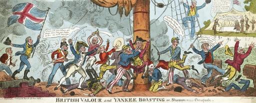 | Keywords: outdoor LC-DIG-PPMSCA-35280: War of 1812, USS Chesapeake vs HMS Shannon. Artwork by George Cruikshank entitled, “British Valour and Yankee Boasting.” Hand-color etched cartoon shows a British boarding party routing the crew of Chesapeake; in a matter of minutes the crew was subdued and the British flag hoisted. The Americans are portrayed as hapless and cowardly. (7/2/2015). LC-DIG-PPMSCA-35280: War of 1812, USS Chesapeake vs HMS Shannon. Artwork by George Cruikshank entitled, “British Valour and Yankee Boasting.” Hand-color etched cartoon shows a British boarding party routing the crew of Chesapeake; in a matter of minutes the crew was subdued and the British flag hoisted. The Americans are portrayed as hapless and cowardly. (7/2/2015). |
