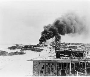 | Keywords: blackandwhite monochrome outdoor black and white LC-USZ62-113548: Battle of Midway, June 1942: Damage on Sand Island, Midway, following the Japanese air attack delivered on the morning of 4 June 1942. This view, probably photographed from the power-plant roof, looks roughly south west, along what was then Sand Island's southern shore. Building in the foreground is the laundry, which was badly damaged by a bomb. Oil tanks are burning in the distance. Note pilings and surf in the left distance. Similar to National Archives photograph, 80-G-17057. (7/2/2015). LC-USZ62-113548: Battle of Midway, June 1942: Damage on Sand Island, Midway, following the Japanese air attack delivered on the morning of 4 June 1942. This view, probably photographed from the power-plant roof, looks roughly south west, along what was then Sand Island's southern shore. Building in the foreground is the laundry, which was badly damaged by a bomb. Oil tanks are burning in the distance. Note pilings and surf in the left distance. Similar to National Archives photograph, 80-G-17057. (7/2/2015). |
