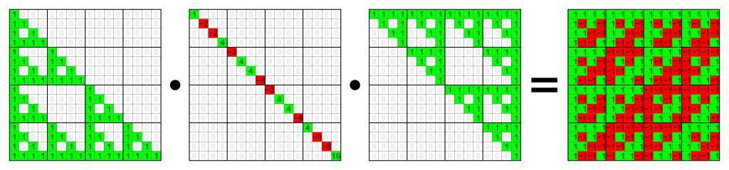Keywords: LDU decomposition of Walsh 16.svg LDU decomposition of the Walsh matrix of order 16 Positive numbers are green the zero white negatives red The ones in the lower and upper triangular matrices form Sierpinski triangles The entries of the diagonal matrix are values from Gould's sequence A001316 <br> with the minus signs distributed like the ones in Thue “Morse sequence A01006 <br> own Watchduck Walsh matrix of order 16 Matrix multiplication LU decomposition Sierpinski triangles in binary 16x16 matrices Integer sequence Thue-Morse sequence |