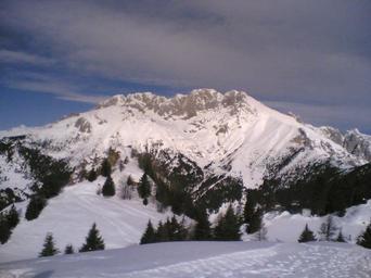 | Keywords: Le cime della Presolana.jpg La parete sud della presolana Da sinistra a destra le maggiori cime del gruppo la Presolana di Castione 2474m la Presolana Occidentale 2521m la Presolana Centrale 2517 m la Presolana Orientale 2490 m e il Monte Visolo 2370 m appena più a destra della Cima Orientale In primo piano rispetto alla cima Occidentale il Pizzo di Corzene 2012 m mentre sono appena visibili sulla destra le Quattro Matte 2122m La foto è stata scattata dal Monte Scanapà Own 2008-01-20 Ananke88 Presolana |