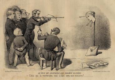 | Keywords: Le prix de l'adresse aux Champs-Elysées.jpg The price of the address on the Champs-Elysées<br> - Whoever knocks it off will be my minister Louis-Napoléon Bonaparte sits on a chair as men who wish to become his minister try to knock the head of a statue of Marianne off of a pole with a cross-bow 1848-1851 lithograph Institution Brown University Library object history exhibition history credit line Le Charivari accession number 113199460734640 PD-old Lithographs of Paris Images of Paris from the Brown University Library Caricatures of Napoleon III Caricature of Marianne Bow and arrow in art Caricatures of politicians of France Odilon Barrot Caricatures of Adolphe Thiers Crossbows in art Louis Véron |