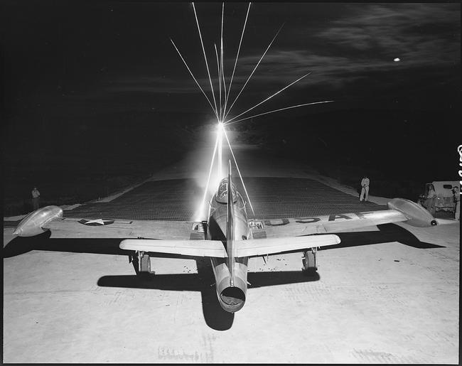 | Keywords: Leaving a fiery trail, .50 caliber bullets streak through the night as maintenance men of the 49th Fighter Bomber... - NARA - 542257.tif Scope and content General notes 542257 Local identifier 342-AF-82753AC Department of Defense Department of the Air Force 09/26/1947 - Still Picture Records Section Special Media Archives Services Division NWCS-S National Archives at College Park 8601 Adelphi Road College Park MD 20740-6001 ca 08/1952 Record group Record Group 342 Records of U S Air Force Commands Activities and Organizations 1900 - 2003 Record group ARC 654 Black and White Photographs of U S Air Force and Predecessors' Activities Facilities and Personnel Domestic and Foreign compiled 1930 - 1975 documenting the period 1863 - 1975 Series ARC 542185 File unit File unit ARC Variant control numbers Agency-Assigned Identifier NASM 4A 26521<br /> NAIL Control Number NWDNS-342-AF-82753AC yes Other versions NARA-cooperation PD-USGov F-84 Thunderjets in the Korean War 49th Fighter Wing United States Air Force |