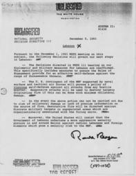 | Keywords: Lebanon - NARA - 198258.jpg Scope and content General notes 198258 Local identifier President 1981-1989 Reagan National Security Council 1981 - 1989 Ronald Reagan Library NLRR 40 Presidential Drive Simi Valley CA 93065-0600 1983-12-05 Record group Collection RR-NSC Numbered National Security Policy Papers 1981 - 1989 Record group ARC 1189 National Security Decision Directives compiled 02/25/1981 - 01/19/1989 Series ARC 198166 File unit File unit ARC Variant control numbers NAIL Control Number NLS-NSC-NSDD-117 Other versions <gallery> File Lebanon_-_NARA_-_198258 tif tif File Lebanon_-_NARA_-_198258 jpg jpg </gallery> NARA-cooperation PD-USGov Presidential Decision Directives Reagan |