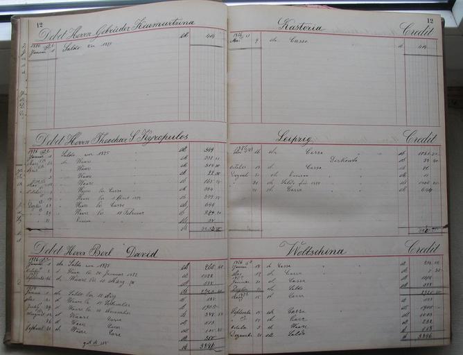 | Keywords: Ledger of the fur trader Dedo from Leipzig, 1876-1885 012.jpg 011 013 Hauptbuch des Rauchwarenhändlers Dedo aus Leipzig Bismarcksstr o/P 78 No 11 Herren Gebrüder Kiumurtzina Kastoria Herrn Theodar S Kyropulos Leipzig Herrn Berl David Woltschina Woltschina probably the former name of a town in Russia Ledger of a wholesale fur dealer Germany Leipzig aus eigenem Besitz 1876 first entry Dedo PD-old Furriers and fur traders of Leipzig named in the accountancy of Naoum Dedo in Leipzig Kyropulos Th History of fur trade in Kastoria Kiumurtzina Furriers and fur traders of Kastoria named in the accountancy of Naoum Dedo in Leipzig Kiumurtzina Furriers in Russia David Berl Fur wholesale dealers in Russia David Berl Ledger of the fur trader Dedo in Leipzig 1876-1885 |