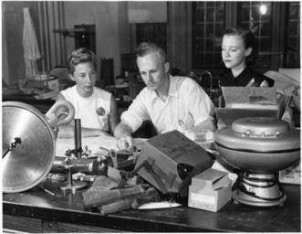 | Keywords: smithsonian institution smithsonianinstitution smithsonian institution archives smithsonianinstitutionarchives 2012 women's history month womenshistorymonth women in science womeninscience women man danish norwegian laboratory equipment scale biology zoology duke university secretary physiology academia 20th century - mid 20thcenturymid people groupshot blackandwhite monochrome indoor performer musician black and white Subject: Schmidt-Nielsen, Bodil        Schmidt-Nielsen, Knut 1915-        Wagner, Barbara        Duke University Type: Black-and-white photographs Topic: Physiology      Zoology      Camels      Women scientists Local number: SIA Acc. 90-105 [SIA2009-2749] Summary: left to right: Bodil Mimi Krogh Schmidt-Nielsen (b. 1918), Knut Schmidt-Nielsen (1915-2007), and Barbara Wagner. The Schmidt-Nielsens were professors in comparative physiology at Duke University and Wagner was a secretary in the Duke zoology department. They are shown with research equipment being assembled for an expedition to the Sahara Desert to study camels. In the left foreground is a scale used for weighing camels Cite as: Acc. 90-105 - Science Service, Records, 1920s-1970s, Smithsonian Institution Archivess Persistent URL:Link to data base record Repository:Smithsonian Institution Archives View more collections from the Smithsonian Institution. Subject: Schmidt-Nielsen, Bodil Schmidt-Nielsen, Knut 1915- Wagner, Barbara Duke University Type: Black-and-white photographs Topic: Physiology Zoology Camels Women scientists Local number: SIA Acc. 90-105 [SIA2009-2749] Summary: left to right: Bodil Mimi Krogh Schmidt-Nielsen (b. 1918), Knut Schmidt-Nielsen (1915-2007), and Barbara Wagner. The Schmidt-Nielsens were professors in comparative physiology at Duke University and Wagner was a secretary in the Duke zoology department. They are shown with research equipment being assembled for an expedition to the Sahara Desert to study camels. In the left foreground is a scale used for weighing camels Cite as: Acc. 90-105 - Science Service, Records, 1920s-1970s, Smithsonian Institution Archivess Persistent URL:Link to data base record Repository:Smithsonian Institution Archives View more collections from the Smithsonian Institution. |