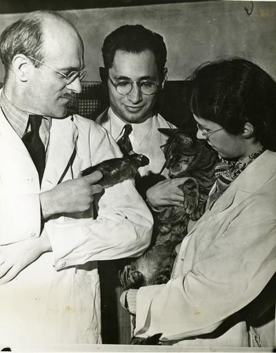 | Keywords: smithsonian institution smithsonianinstitution smithsonian institution archives smithsonianinstitutionarchives women's history month womenshistorymonth women in science womeninscience 2014 2014-03-01 20140301 people monochrome indoor Subject: Maier, R. F (Raymond Frederick) 1900-1977        Glaser, Nathan M        Sherburne, Barbara Jean b. 1914        University of Michigan Type: Black-and-white photographs Topic: Women scientists      Psychology Local number: SIA Acc. 90-105 [SIA2008-5796] Summary: Left to right: Psychologists Norman R. F. (Raymond Frederick) Maier (1900-1977), Nathan M. Glaser (d. 2011), and Barbara Jean Sherburne (Stewart) (b. 1914). Maier is holding one of the rats used in their experiments; Sherburne is holding her cat "Peter" (who lived in the laboratory). Maier worked at University of Michigan from 1931-1977, so this photograph was probably taken in the Michigan laboratory Cite as: Acc. 90-105 - Science Service, Records, 1920s-1970s, Smithsonian Institution Archives Persistent URL:Link to data base record Repository:Smithsonian Institution Archives View more collections from the Smithsonian Institution. Subject: Maier, R. F (Raymond Frederick) 1900-1977 Glaser, Nathan M Sherburne, Barbara Jean b. 1914 University of Michigan Type: Black-and-white photographs Topic: Women scientists Psychology Local number: SIA Acc. 90-105 [SIA2008-5796] Summary: Left to right: Psychologists Norman R. F. (Raymond Frederick) Maier (1900-1977), Nathan M. Glaser (d. 2011), and Barbara Jean Sherburne (Stewart) (b. 1914). Maier is holding one of the rats used in their experiments; Sherburne is holding her cat "Peter" (who lived in the laboratory). Maier worked at University of Michigan from 1931-1977, so this photograph was probably taken in the Michigan laboratory Cite as: Acc. 90-105 - Science Service, Records, 1920s-1970s, Smithsonian Institution Archives Persistent URL:Link to data base record Repository:Smithsonian Institution Archives View more collections from the Smithsonian Institution. |