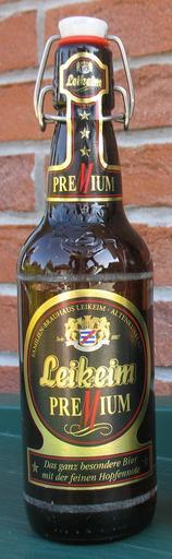 Keywords: Leikeim Premium.jpg en A bottle of Leikeim Premium pilsener beer own Miguel Andrade 2010-10-16 Beer bottles brown glass Beers of Bavaria Swing top bottles