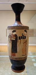 | Keywords: Lekythos with women going to cemetery, view 1, near the Timokrates Painter, Greek, Attica, c. 460 BC, ceramic, red figure decoration on white ground - Chazen Museum of Art - DSC02692.JPG en Exhibit in the Chazen Museum of Art University of Wisconsin-Madison Madison Wisconsin USA This artwork is old enough so that it is in the public domain Photography was permitted in the museum without restriction 2013-07-21 14 33 41 own Daderot cc-zero Ancient Greek pottery in the Chazen Museum of Art Uploaded with UploadWizard White-ground lekythoi |