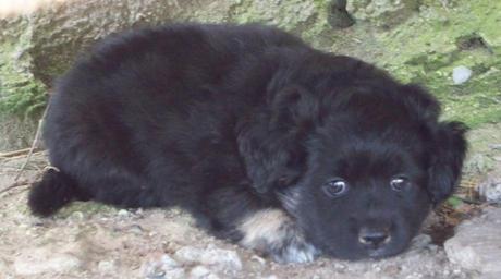 Keywords: Leo mongrel.JPG 6 week old mongrel mother black brown spitz-dachshund mongrel; father white-creme Shi-Tzu own 2006-05-15 Inugami-bargho Shih Tzu hybrids Dachshund hybrids Six-week-old puppies Prone dogs head on ground