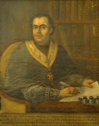 | Keywords: Leonardo Santander y Villavicencio (Universidad de Sevilla).jpg El prelado Leonardo Santander Villavicencio 1768-1832 fue obispo de Quito obispo de Jaca y de Astorga canónigo magistral de la Iglesia colegial del Divino Salvador de Sevilla y caballero gran cruz de la Orden de Isabel la Católica Y el retratado aparece vestido con una toga luciendo la gran cruz de la Orden de Isabel la Católica y en actitud de escribir 1824 oil canvas Size cm 90 102 Institution Universidad de Sevilla http //www patrimonioartistico us es/objeto jsp id 710 tipo v elto 4 buscando true repetir truehttp //www catholic-hierarchy org/bishop/bsantan html object history exhibition history credit line En el anverso hay una inscripción latina que reza «Excellent et illust D D Leonardus Santander Villavicencio hispalensis in hac omnium scien-/ tiarum regali academia sacrae teologiae doctor Insignis eclesiae collegiatae sancti salvatoris hispalensis/ canonicus magistralis et in anno MDCCCXVIII episcopus quitensis ac tandem episcopus iaccensis renuntiatus eques que magnae regalis crucis Elisabethae Catholicae anno MDCCCXXIV aetatis suae LVI» accession number 0708-00-REC-PINT http //www patrimonioartistico us es/objeto jsp id 710 tipo v elto 4 buscando true repetir true PD-old-100 Uploaded with UploadWizard Leonardo Santander y Villavicencio Colección Retratos de Universitarios Ilustres Universidad de Sevilla José María Arango |