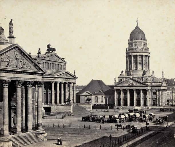 | Keywords: Leopold Ahrendts Gendarmenmarkt Berlin 1850s.jpg Gendarmenmarkt with farmer's market Berlin Mid 1850s Gold-toned albumen print 18 x 21 5 http //www bassenge com Galerie Bassenge s 1850 Leopold Ahrendts 1825 ”1870 PD-old-100 Images from Galerie Bassenge Leopold Ahrendts Berlin in the 1850s Deutscher und Französischer Dom Berlin |