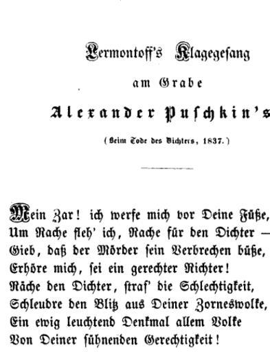 | Keywords: Lermontoff, 1852, p.49.png  ru Из книги Gesammelte Schriften Gesammt-Ausg in zwölf Bänden Berlin 1852 Пе вая публикация стихотво ения Ле монтова  а сме ть Пушкина на немецком языке http //books google ru/books id l5QBAAAAMAAJ pg PA3 dq v onepage q f false Friedrich Martin von Bodenstedt 1852 Lermontov Gallery PD-old |
