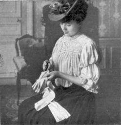 | Keywords: LES BAGUETTES Introduire delicatement.jpg LES BAGUETTES Introduire délicatement les baguettes et ouvrir avec précaution très peu les doigts Femina page 540 1905 H D PD Image LES_BAGUETTES_Introduire_delicatement jpg Femina La Femme et la Gant LES BAGUETTES Introduire délicatement les baguettes et ouvrir avec précaution très peu les doigts LE COMMENCEMENT Opération qui doit être menée avec prudence un geste nerveux et la peau du gant se déchire POSITION CORRECTE Les quatre doigts sont introduits complètement ne font plus un pli c'est le moment de passer le pouce Imprimerie de Femina - ÉD CRÉTÉ LE CARACTÈRE DÉVOILÉ PAR LA FAÇON DE METTRE ET DE RETIRER LES GANTS - RECETTE PRATIQUE ON discerne le caractère par l'écriture la couleur des yeux la teinte des cheveux mais il n'est pas besoin de tant d'études au véritable observateur il lui suffit de regarder une femme mettre ses gants Voici la nerveuse exaspérée par la perspective de cette opération compliquée Elle commence par introduire sagement sa jolie main puis elle s'aperçoit qu'elle a oublié d'ouvrir les doigts et de mettre de la poudre et retire avec un peu d'impatience déjà le gant qu'elle avait commencé à mettre Les doigts ouverts avec une hâte fébrile la poudre introduite un regard est jeté à la pendule Hélas c'est le retard le terrible retard Dépêchons-nous La main qui met le gant se crispe et le désastre ne tarde pas un bruit sinistre se fait entendre la peau vient de céder un peu vers la paume Baste cela ne se verra pas Continuons le premier bouton saute puis le second puis le troisième Pendant ce temps la petite déchirure s'est agrandie L'événement a fait place à la fureur la fureur aux trépignements et les trépignements aux larmes Et les - aiguilles de la pendule tournent toujours impitoyables Au contraire voici la méthodique qui met ses gants rationnellement et raisonnablement Examen d'abord de la marchandise Les baguettes élargissent ensuite très peu juste ce qu'il faut les doigts qui cèdent à cette douce mais énergique pression Un peu de poudre pas trop puis grâce à une lenteur - savante l'opération se termine sans encombre les gants sont mis ils ne font pas un pli la main s'y meut à l'aise sans être serrée ridiculement sans non plus être trop au large comme la main de Dumanet ou de Pitou dans ses « chaussettes » du dimanche H D LE BOUTON Boutonnez d un geste patient ou les boutons sauteront l'un après l'autre L'IMPATIENTE Retire son gant avec les dents au bout de deux fois la paire est bonne à jeter POUR RETIRER LE GANT Après avoir retiré le gant en le retournant le laisser ainsi une heure ou deux 540 Le Gérant JARRIGE Black and white photographs of sitting women People with white gloves Fashion_in_1905 Women facing left Femina French magazine PD-old |