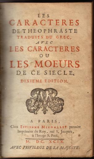 | Keywords: Les Caractères 10e ed 1699.jpg fr Page de garde de la 10eme édition des Caractères de Théophraste traduit du Grec avec les Caractères et Mœurs de ce siècle de La Bruyère Michallet Editeur Paris 1699 Own gerardgiraud 2010-08-13 Jean de La Bruyère |