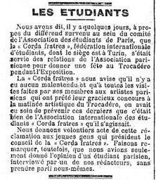 | Keywords: Les étudiants - La Presse - 8 novembre 1900 - page 3, 1ère colonne.jpg fr Article sur une fête donnée à Paris en 1900 par la Corda Fratres La Presse 8 novembre 1900 page 3 1ère colonne http //gallica bnf fr/ark /12148/bpt6k5496883/f3 image r langFR La Presse anonymous 1900-11-08 Domaine public 1900 La Presse Paris Corda Fratres PD-old |