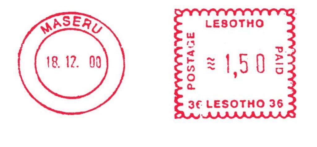 Keywords: Lesotho stamp type BA6.jpg en Meter stamp catalog image Lesotho type BA6 Richard Stambaugh Richard Stambaugh 2011-11-13 Meter stamps of Lesotho