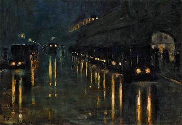 | Keywords: Lesser Ury Hochbahnhof Bülowstraße bei Nacht 1922.jpg Hochbahnhof Bülowstraße bei Nacht oil on canvas 70 x 100 5 cm object history unknown Ury 1922 ~ lower left signature http //www villa-grisebach de/ 1922 Creator Lesser Ury thumb left PD-old-auto 1931 Lesser Ury 1922 paintings Paintings of Berlin Night landscape paintings Night in Berlin U-Bahnhof Bülowstraße Berlin Paintings of streets Paintings of automobiles Rain in art Images from Villa Grisebach Auktionen Train stations at night in Germany |