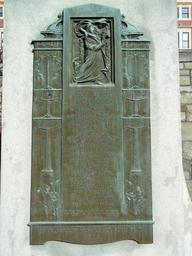 | Keywords: Lest We Forget detail - World War I Memorial - Marlborough, MA - DSC04377.JPG A figure of a World War I soldier with his head bowed and a cross used to mark soldiers graves in his proper right hand At his feet are a helmet and barbed wire The sculpture stands atop a stone base that is adorned with bronze inscription plaques featuring allegorical figures of Peace Inscription John Hardy Around bronze base of sculpture WORLD WAR/LEST WE FORGET/1914-1919 On bronze plaque on front of base list of names / TO YOU FROM FAILING HANDS WE THROW/THE TORCH BE YOURS TO BEAR IT HIGH /MARLBOROUGH HONORS HER HERO DEAD/1923 signed Daderot 2012-02-20 11 05 20 Daderot cc0 cc0 Lest We Forget by John G Hardy |