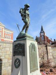 | Keywords: Lest We Forget - World War I Memorial - Marlborough, MA - DSC04388.JPG A figure of a World War I soldier with his head bowed and a cross used to mark soldiers graves in his proper right hand At his feet are a helmet and barbed wire The sculpture stands atop a stone base that is adorned with bronze inscription plaques featuring allegorical figures of Peace Inscription John Hardy Around bronze base of sculpture WORLD WAR/LEST WE FORGET/1914-1919 On bronze plaque on front of base list of names / TO YOU FROM FAILING HANDS WE THROW/THE TORCH BE YOURS TO BEAR IT HIGH /MARLBOROUGH HONORS HER HERO DEAD/1923 signed Daderot 2012-02-20 11 07 29 Daderot cc0 cc0 Lest We Forget by John G Hardy |