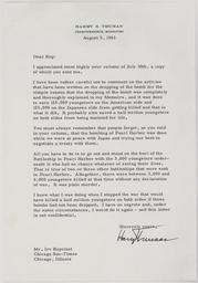 | Keywords: Letter from Harry S. Truman to Irv Kupcinet (unsent) - NARA - 201504.tif Scope and content In this letter which was not sent to Chicago newspaper columnist Irv Kupcinet former President Truman defends his decision to use the atomic bomb against Japan in World War II Asserting that use of the bomb saved American and Japanese lives by ending the war Mr Truman observes that the attack on Pearl Harbor occurred while the United States was at peace with Japan and resulted in the deaths of thousands of American servicemen General notes 201504 Local identifier Truman Harry S 1884-1972 Harry S Truman Library NLHST 500 West U S Highway 24 Independence MO 64050-1798 1963-08-05 Record group Collection HST-PPP The Papers of Harry S Truman Post-Presidential Papers ca 01/1953 - ca 12/1972 Record group ARC 1204 Subject Files compiled 1953 - 1972 Series ARC 201502 File unit File unit ARC Variant control numbers NAIL Control Number NLT-PPP-A-19630805 yes Other versions NARA-cooperation PD-USGov Harry S Truman documents Atomic bombings of Hiroshima and Nagasaki 1963 letters Chicago Sun-Times Irv Kupcinet |