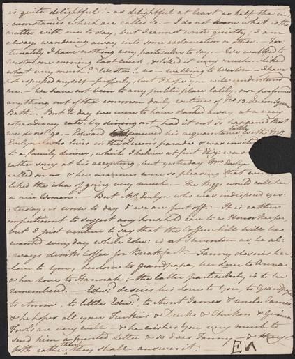 | Keywords: Letter from Jane Austen to her sister Cassandra, 1799 June 11. Page 3 (NLA).tiff en Institution National Library of Australia 1799-06-11 Page 3 of 4 http //nla gov au/nla cat-vn4193159 Creator Jane Austen https //commons wikimedia org/w/index php title File Letter_from_Jane_Austen_to_her_sister_Cassandra _1799_June_11 _2_ NLA tif page 1 page 2 page 3 page 4 Transcription is quite delightful -- as delightful at least as half the circumstances which are called so I do not know what is the matter with me to-day but I cannot write quietly; I am always wandering away into some exclamation or other Fortunately I have nothing very particular to say We walked to Weston one evening last week and liked it very much Liked what very much Weston No walking to Weston I have not expressed myself properly but I hope you will understand me We have not been to any public place lately nor performed anything out of the common daily routine of No 13 Queen Square Bath But to-day we were to have dashed away at a very extraordinary rate by dining out had it not so happened that we did not go Edward renewed his acquaintance lately with Mr Evelyn who lives in the Queen's Parade and was invited to a family dinner which I believe at first Elizabeth was rather sorry at his accepting; but yesterday Mrs Evelyn called on us and her manners were so pleasing that we liked the idea of going very much The Biggs would call her a nice woman But Mr Evelyn who was indisposed yesterday is worse to-day and we are put off It is rather impertinent to suggest any household care to a housekeeper but I just venture to say that the coffee-mill will be wanted every day while Edward is at Steventon as he always drinks coffee for breakfast Fanny desires her love to you her love to grandpapa her love to Anna and her love to Hannah; the latter is particularly to be remembered Edward desires his love to you to grandpapa to Anna to little Edward to Aunt James and Uncle James and he hopes all your turkeys and ducks and chicken and guinea fowls are very well; and he wishes you very much to send him a printed letter and so does Fanny -- and they both rather think they shall answer it Custom license marker 2014 04 11 PD-old-100 PD-old-100 Uploaded with UploadWizard Letters by Jane Austen 1799 letters Photographs in the National Library of Australia |