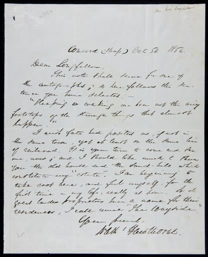 | Keywords: Letter from Nathaniel Hawthorne to Henry Wadsworth Longfellow 1852.jpg en Letter written by Nathaniel Hawthorne to Henry Wadsworth Longfellow October 5 1852 Courtesy of Yale Collection of American Literature Beinecke Rare Book and Manuscript Library Yale University New Haven Conn Beinecke Rare Book Manuscript Library Yale University http //beinecke library yale edu/dl_crosscollex/brbldl_getrec asp fld img id 1270763 Nathaniel Hawthorne 1852-10-5 PD-old-100 Manuscript letters written messages Letters to or from Hawthorne Works of Henry Wadsworth Longfellow |